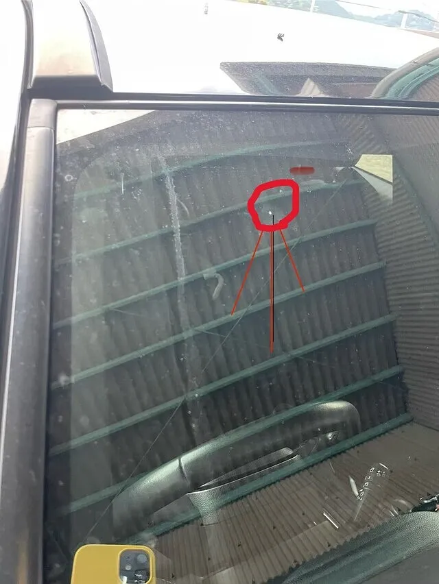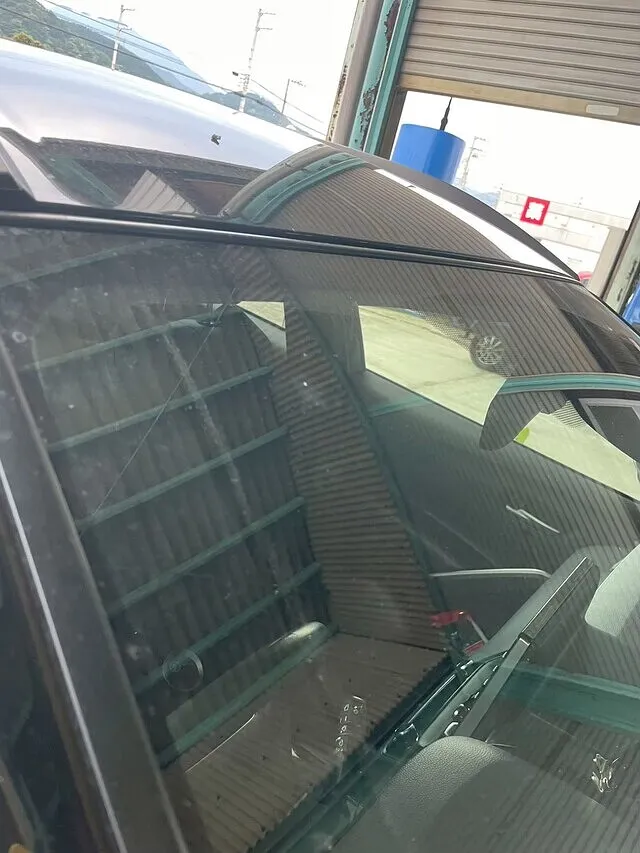 原因:飛び石による点打撃+温度差(エアコンのデフロスター/直射日光)で微細ヒビが伸展。
