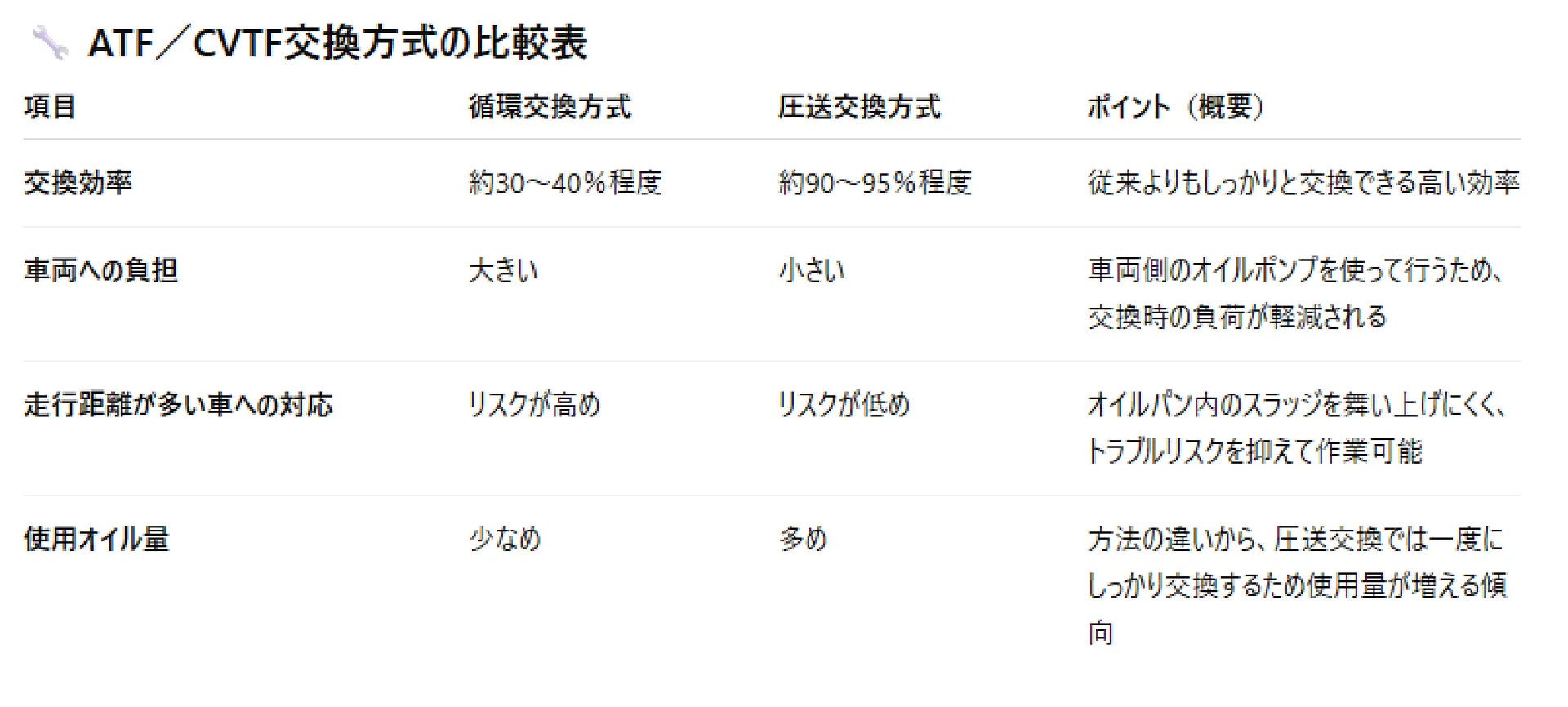 従来の希釈交換ではなく、圧送式による確実な全量交換が行えるため、車本来の変速フィーリングを取り戻し、ミッションの長寿命化にも貢献します。